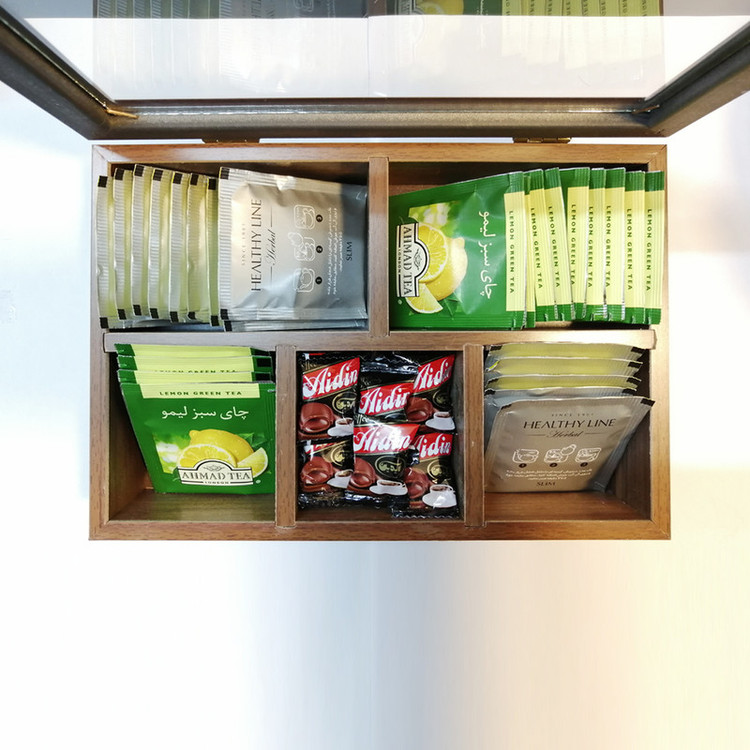 جعبه چوبی ذیل به نحوی زیبا و کاربردی طراحی و تولید شده ، که از آن می توان جهت پذیرایی با انواع دمنوش ها در مهمانی ها و دورهمی ها بهره برد .جعبه چوبی رومیزی مخصوص پذیرایی با انواع چای ، دمنوش و نسکافه طراحی و تولید شده است .